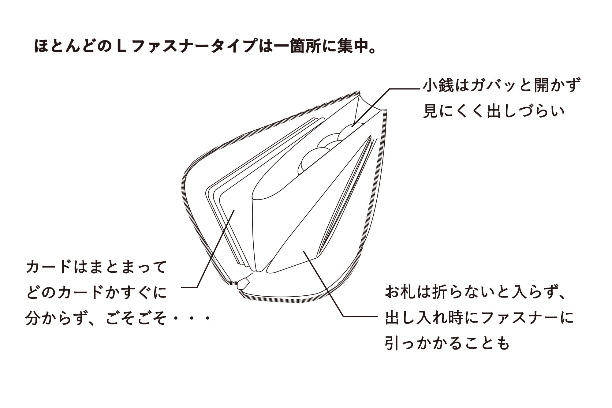全てが一箇所にまとまっているので、一見使いやすそうですが、実際入れてみると、見づらく、出し入れしづらく感じます。マイクロウォレットLFは、使いづらさを解消し、Lファスナーの良さを活かしながら『モノの指定席』を設けることで、見やすく出し入れしやすくなり、それぞれの目的に合わせたクイックな動作が可能になります