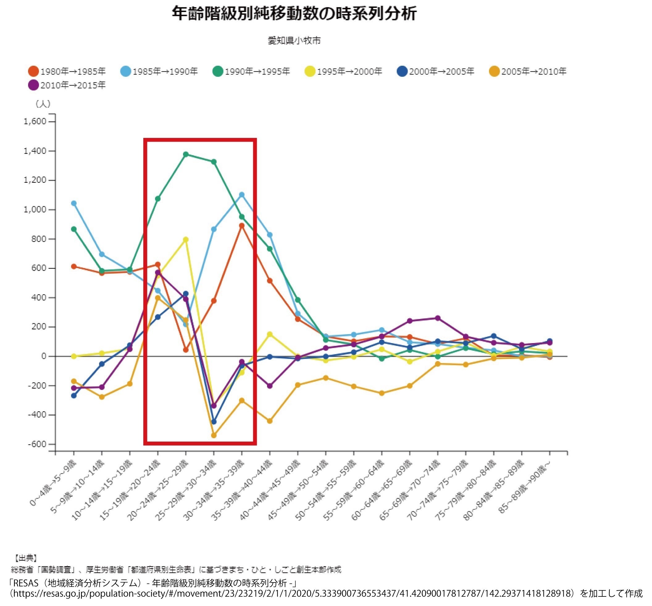 以下のRESAS(地域経済分析システム)で作成した小牧市の年齢階級と時系列の変化図をご覧ください。