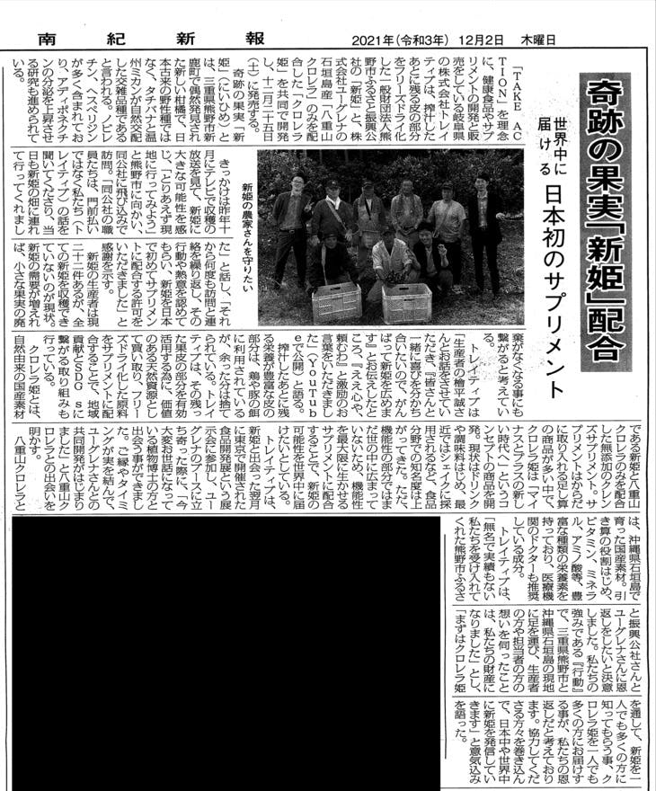 日本で初めて新姫を配合したサプリメント「クロレラ姫」で、東海地方の特産品である三重県熊野市の果実を知ってもらい、新姫の可能性を世界中に届ける「新姫プロジェクト」を是非応援してください!!