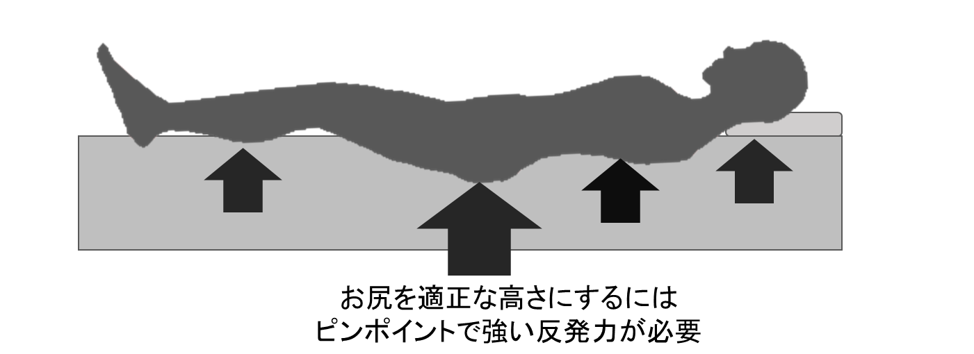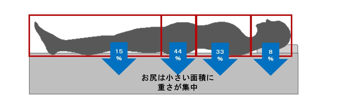 お尻が沈みがちなのは全身に44%もの体圧がかかるのに面積が小さく、高さに保つには他の部分よりも強い反発力が要るからです。