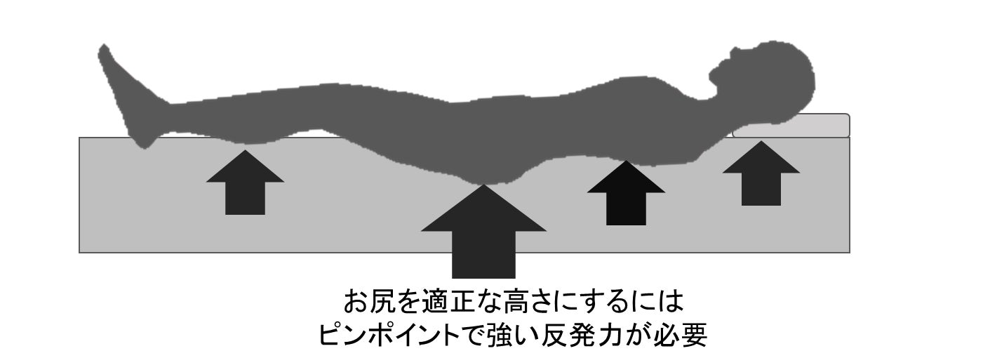 ほとんどのベッドはお尻と背中が一つのマットの上にあり、お尻に合わせると全身には硬すぎ、背中に合わせるとお尻が沈みすぎます。マットに強い反発力ゾーンを作っても、そのゾーンは固定ですので様々な体格のユーザーのお尻だけがちょうどそこにくるかは不確実。合わなければ、寝姿勢は崩れます。