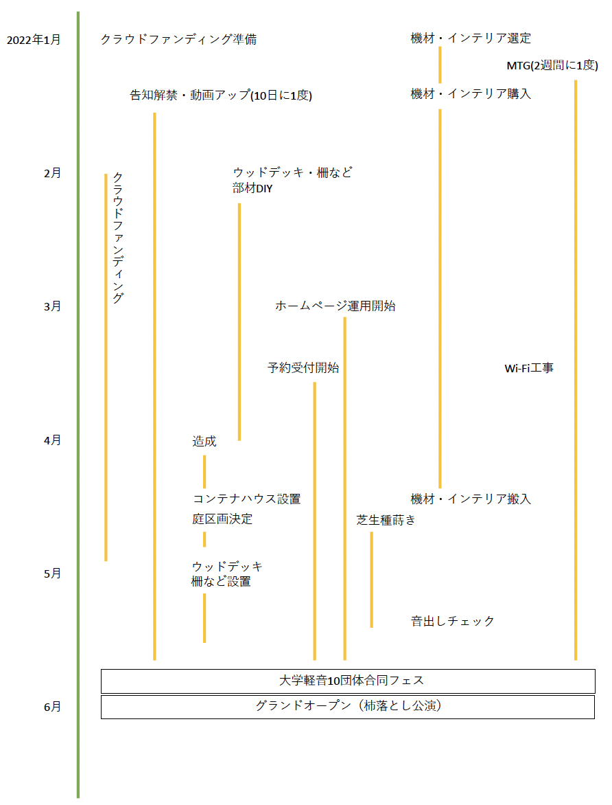 今年は思いのほか寒く、元スキー場だった現地は例年になく雪が積もっています。そのため土木工事も4月になってからの実施となり、コンテナハウスの設置が4月中旬、その後、庭づくり、芝の種まきを始め、ゴールデンウィークに学生たちとウッドデッキなどをDIY、5月中旬にサウンドチェックし、5月末の軽音6団体合同フェスをプレイベントとし、6月よりグランドオープンするスケジュールとなっております。ただ、昨今の情勢を踏まえ、工事の遅れなどが生じる可能性があります。随時活動報告にてお伝えさせていただきたいと思います。