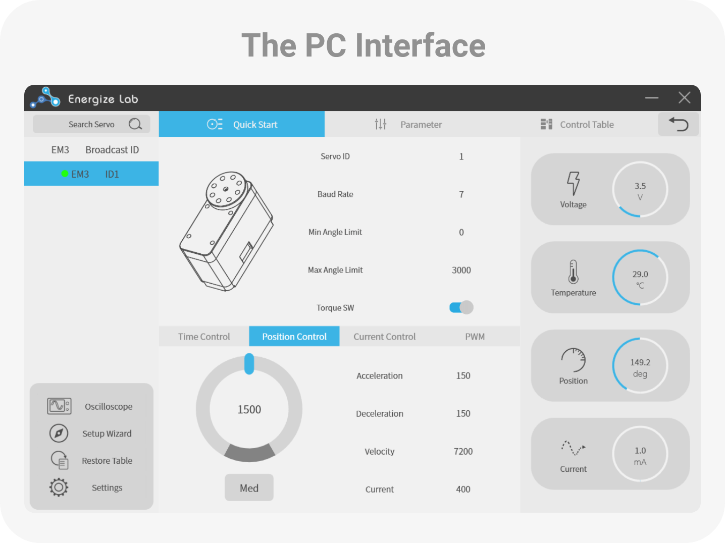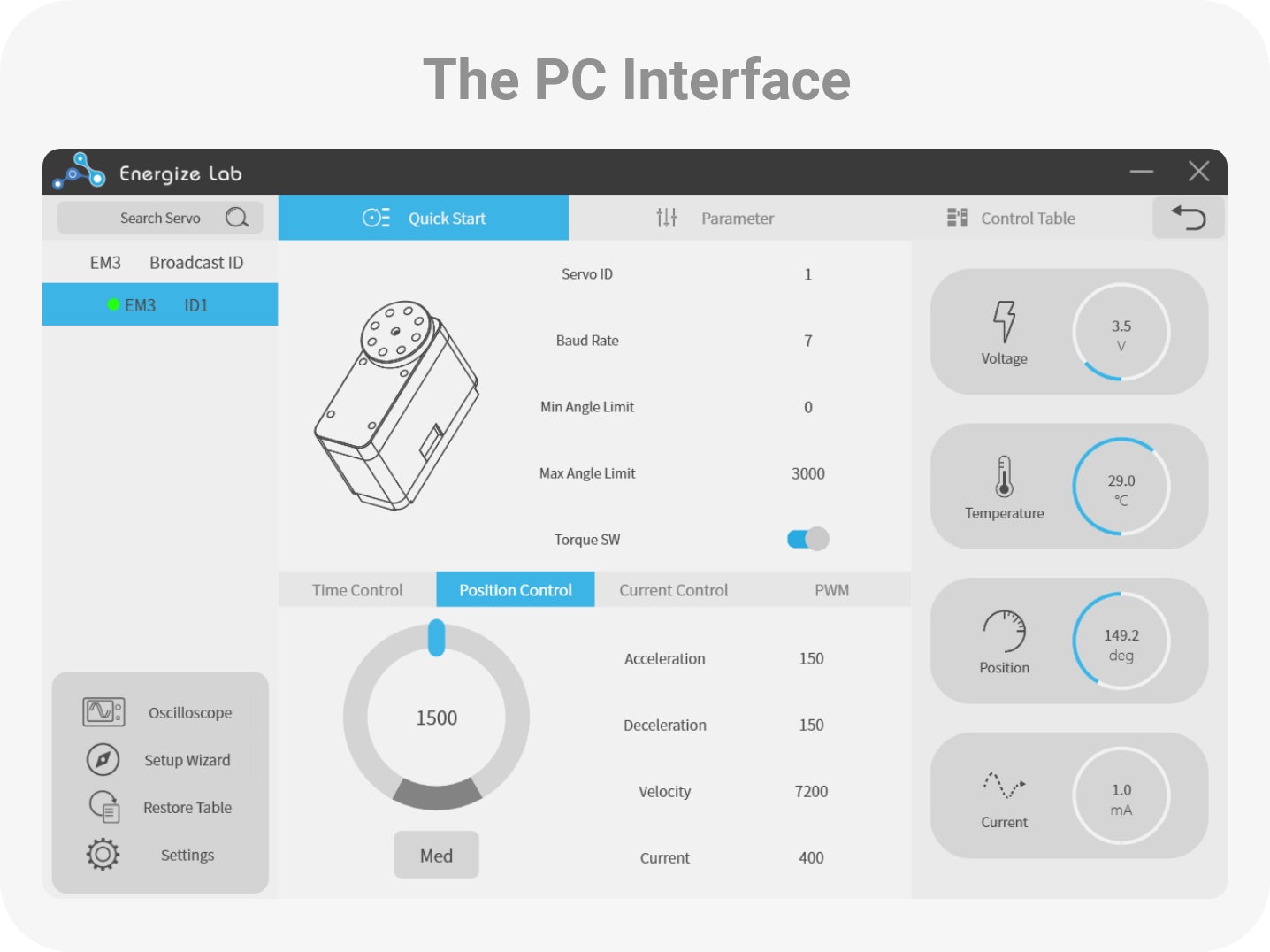 EM3は過負荷クラッチ保護機能により、効率的にギアを保護して外力を相殺できます。位置、電圧、温度、電流のフィードバックは、EM3の包括的な制御プロトコルですべてサポートされています。また、基本的なカレントループ制御も可能です。EM3には、専用の制御とデバッグ用ソフトウェアも付属しています。