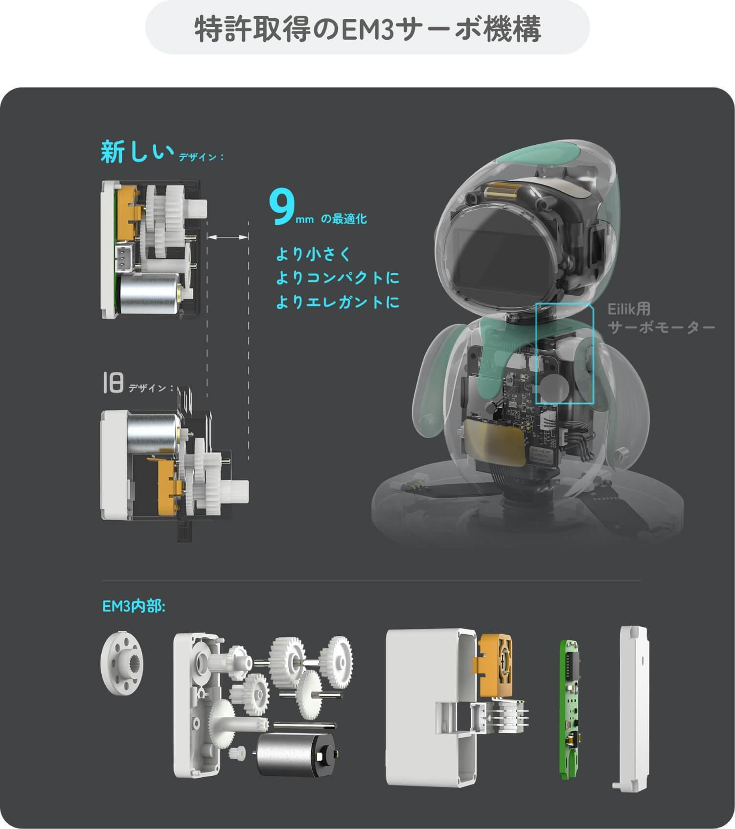 Eilik「アイリック」の腕や体をより柔軟に、かつより俊敏にするために、Energize Labでは新しいサーボモーター:EM3を設計しました。EM3は、ギアの配置から回路基板、制御アルゴリズムに至るまで100%自社開発したものです。従来の9gのサーボ機構と比較すると、EM3のトルクは最大3kgまで到達します。