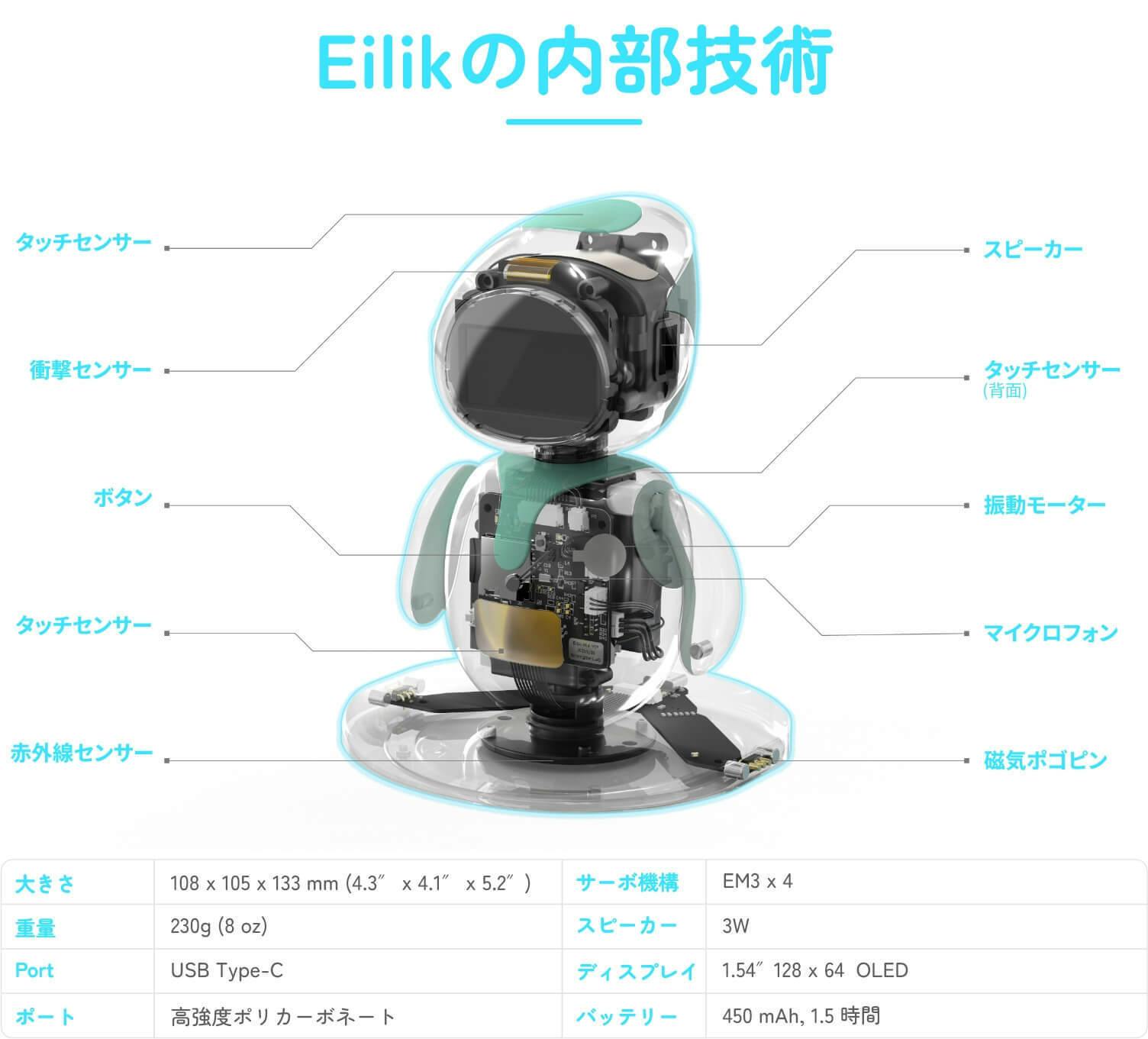 Eilik「アイリック」のアイディアは、有機ELディスプレイのスクリーンから生まれたもの。この2年間、弊社は部品や機能を追加し続けてきました。ロボットの核となるのは、「動き」です。まるで生きているように感じてもらえるよう、ムーブメントデザインとキャラクター設定に力を注ぎました。こうして作り出したEilik「アイリック」のことを、皆様に好きになってもらえたら嬉しいです(^^)