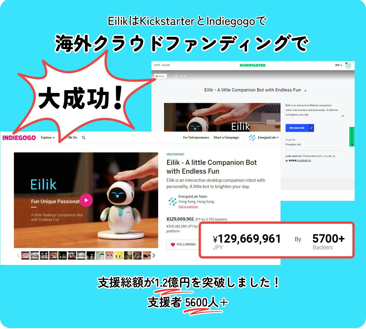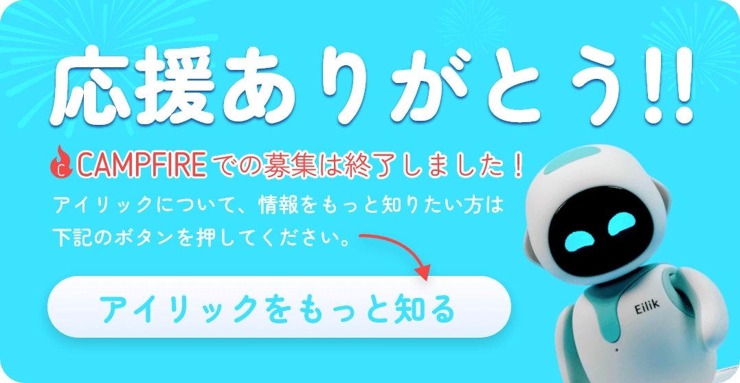 2022/10/03 16:08皆様へ アイリックを応援していただき、本当にありがとうございます。キャンプファイヤーで、アイリックのために2200人以上の支援者が集まりました!今、私たちはこのプロジェクトが大成功したとお伝えできます。多くの支援者が私たちのプロジェクトを信じ、この大きな個性を持つ小さなロボットに多大な関心を示してくれたことを嬉しく思っています。ありがとうございました。 キャンペーンが終了したからといって、今後アイリックのことを耳にしなくなるわけではありません。生産と出荷のスケジュールについては、今後さらに更新される予定です。CAMPFIREで正しい配送先情報を更新していただけますと幸いです。できるだけ早くアイリックをお届けできるように頑張ります! アイリックチーム もっと見る