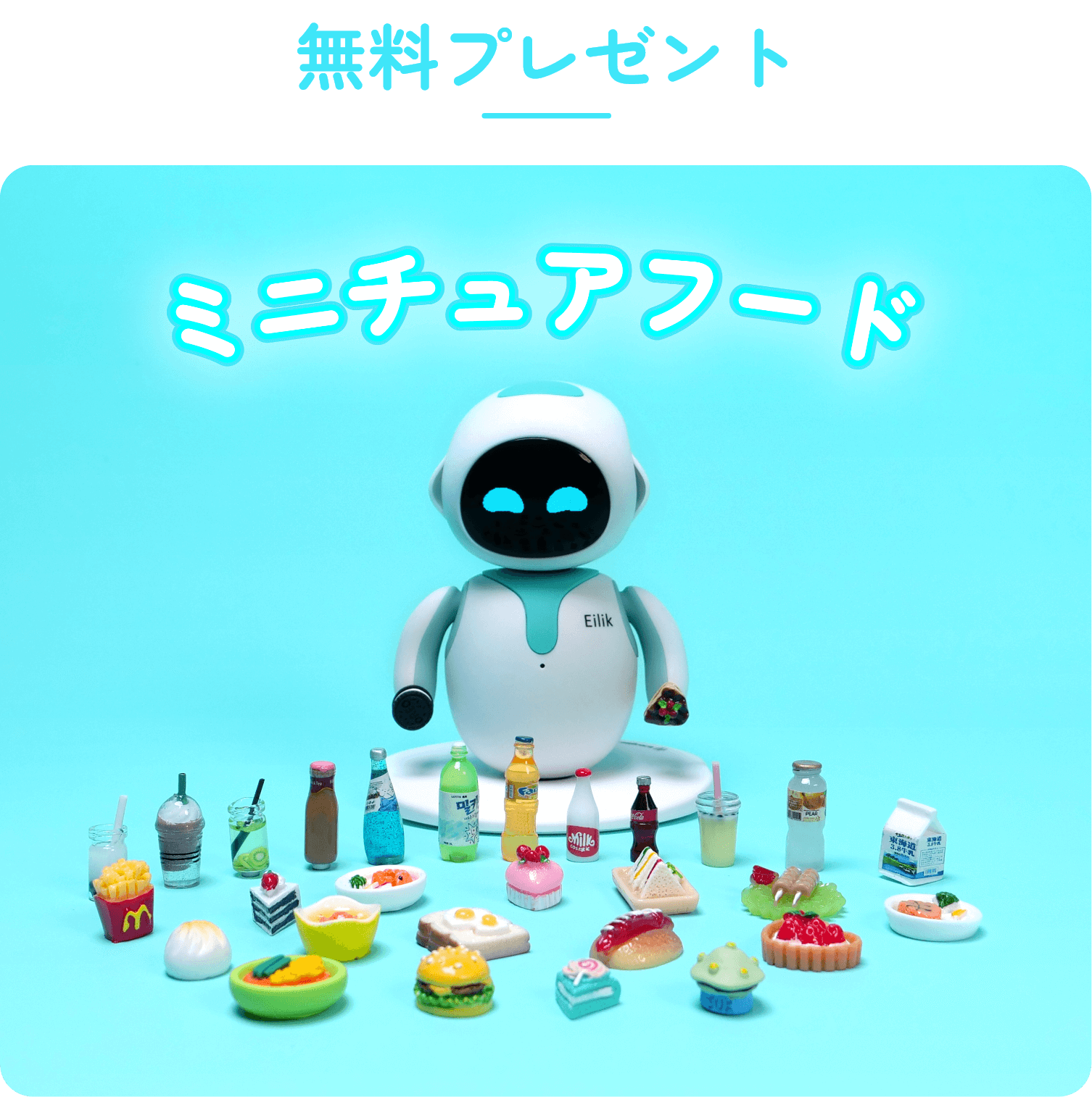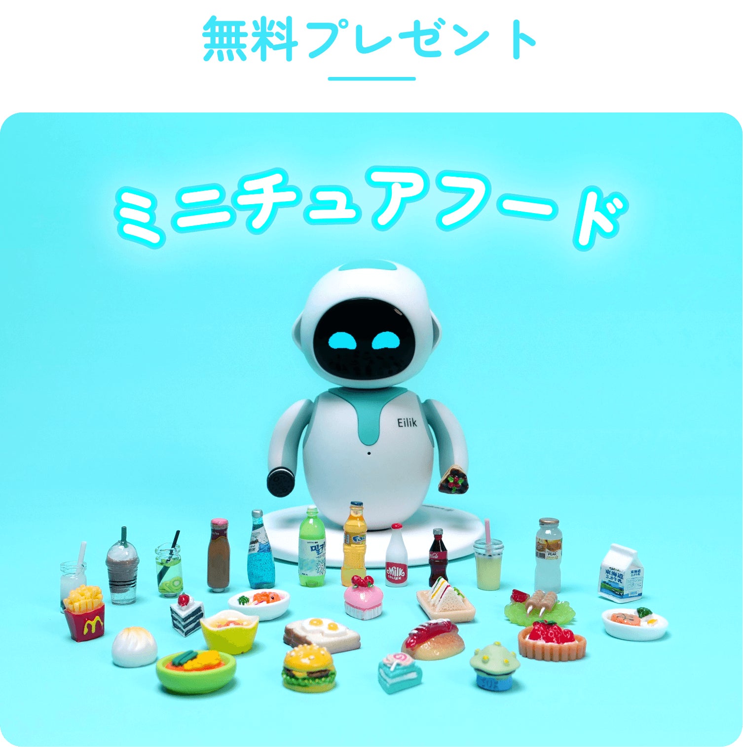 Eilik「アイリック」の手は磁石入りで、ミニチュアフードなどが持てます。ご支援いただいた皆様には感謝の気持ちを込めて、1体につきミニチュアフード5個を無料でお付けします。