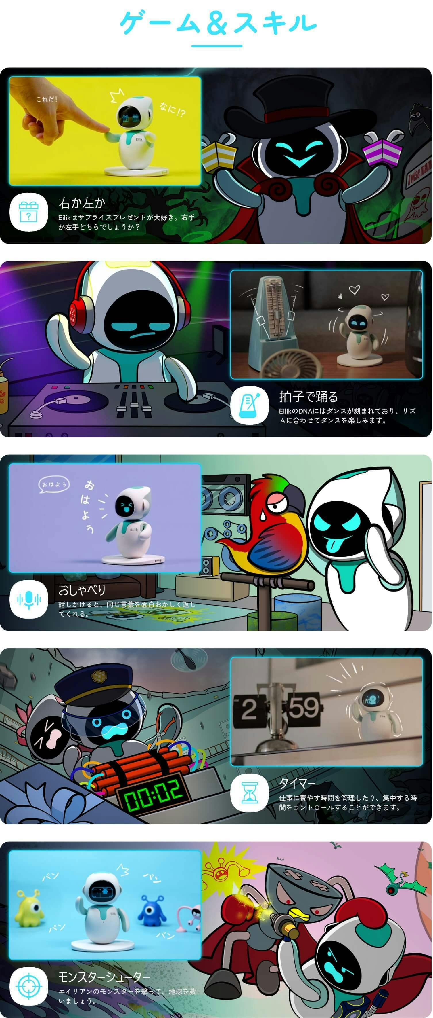 Eilik「アイリック」は想像力に富み、好奇心旺盛で、楽しいロボット。常に持ち主の注意を引き、毎日何か楽しいことを起こしてくれます。調子のいい時はイタズラをしてきたり、落ち込んでいる時はひとりの時間を欲しがったり。退屈知らずのEilik「アイリック」との毎日をぜひ楽しんでください。