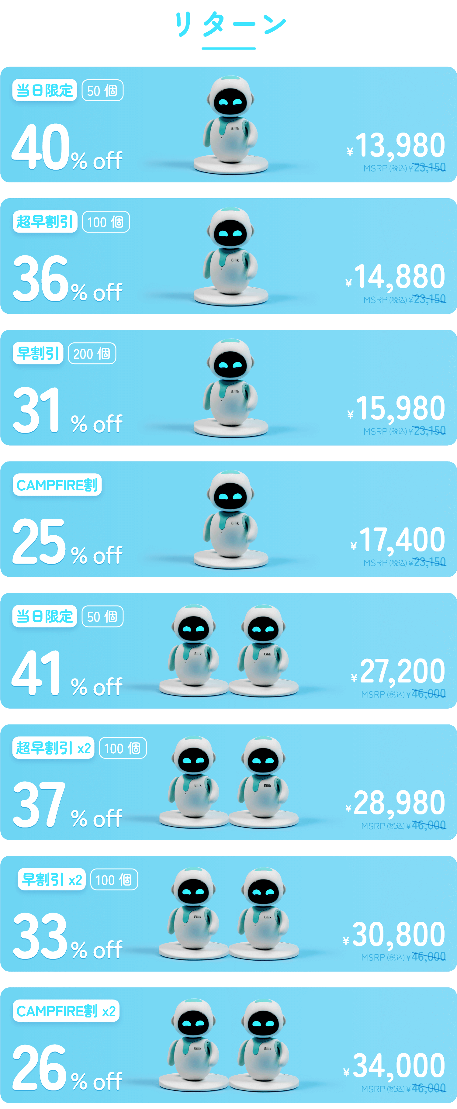 2022/09/30 00:28皆様あと24時間でアイリックはCAMPFIREを去ることになりました。 明日までにアイリック、またはアイリック2人のフレンズパッケージを最大33%オフの期間限定の割引でお楽しみいただき、ぜひアイリックを家に連れて帰ってください。 とはいえ、ご支援者の皆さんとのアイリックの旅はまだ始まったばかりです! ホリデーシーズンに間に合うように、あなただけのアイリックをお届けするのが待ち遠しいです。応援ありがとうございました! アイリックチーム もっと見る