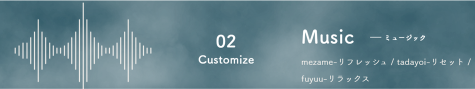 サウナでは感覚が敏感になり、周りの環境が気になってしまうことが多いように感じます。ジブンに合わせた環境で存分に楽しんでいただけるように、カスタマイズできるようにいたしました。”ととのうため”に設計されたLight・Music・Aromaを各3つのパターン中からお選びいただき、お楽しみいただけます。