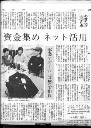 2013/03/28 14:13こんにちは。 1sinの藤原です。 3月27日(水)の読売新聞の朝刊に1sinの活動を掲載していただきました。 内容はCAMPFIREでの資金集めについてが中心で、 南三陸町のお母さん達も一緒に載ってます。 活動をはじめて1年半以上が経ちました。 皆様のご協力で少しずつですがその輪が広がりつつあります。 今後は復興の先につながる仕組みを考えていかなければならないと思います。 今後ともどうぞよろしくお願いいたします。 もっと見る