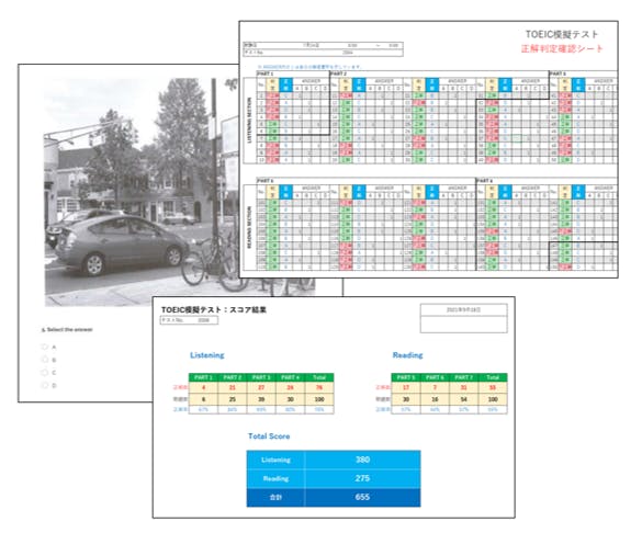 ※事前にテスト方法と解答ファイルをお送りします。各自のパソコンで受験となります。スコアは990点満点の目安スコアです。