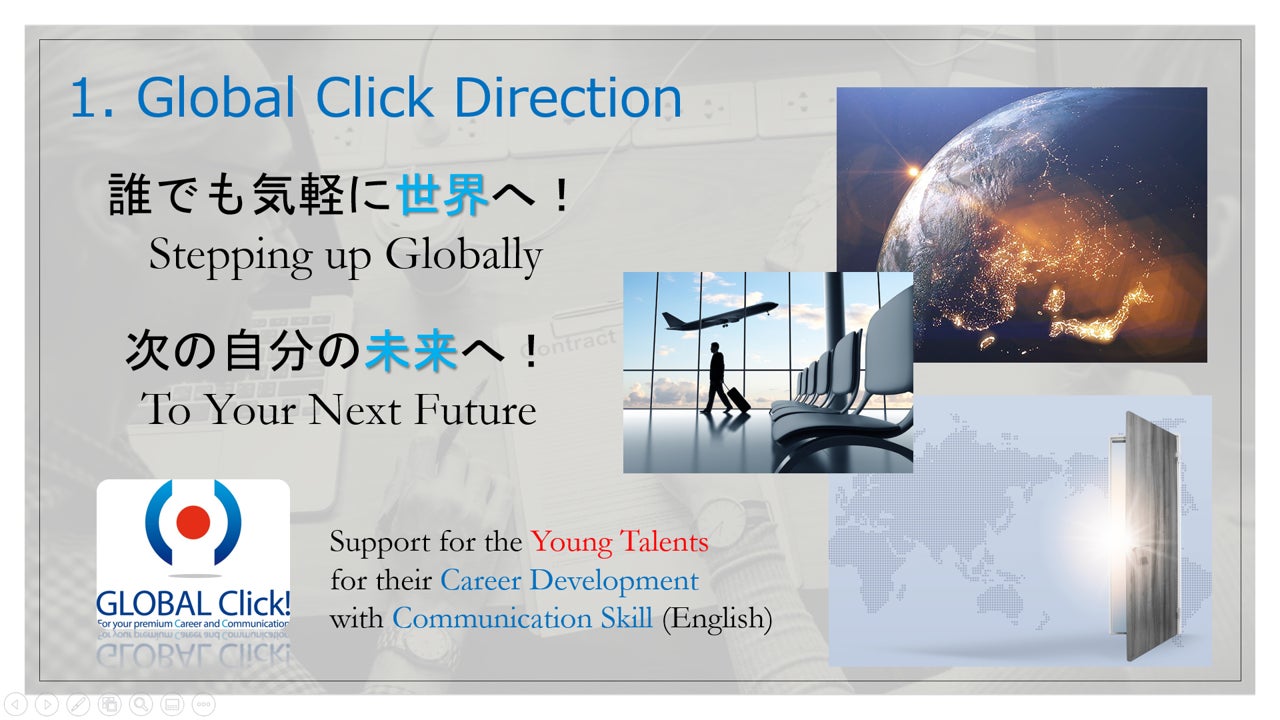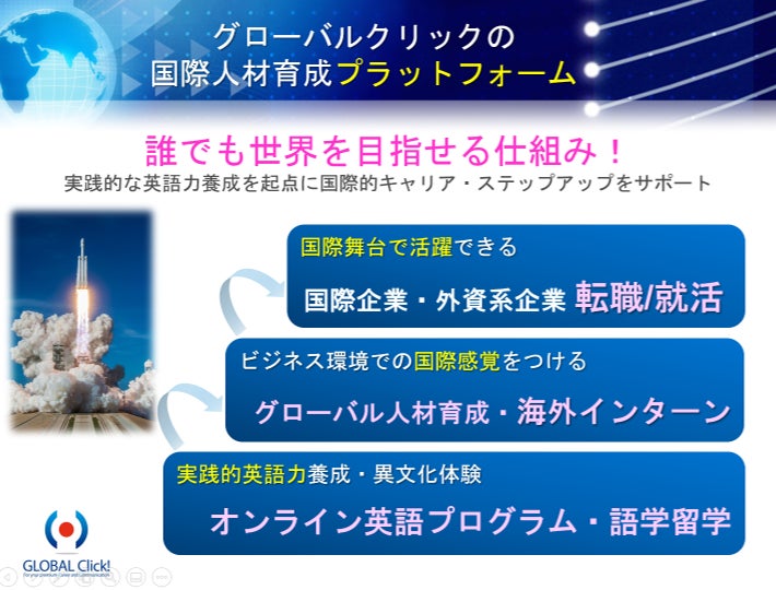 グローバルクリックは、【使える英語力の学習】 を起点として、これから国際舞台・世界に出ていくひとをサポートする『グローバル人材育成事業』 を行っています。「集まれ、次の未来を担う若者たち!」