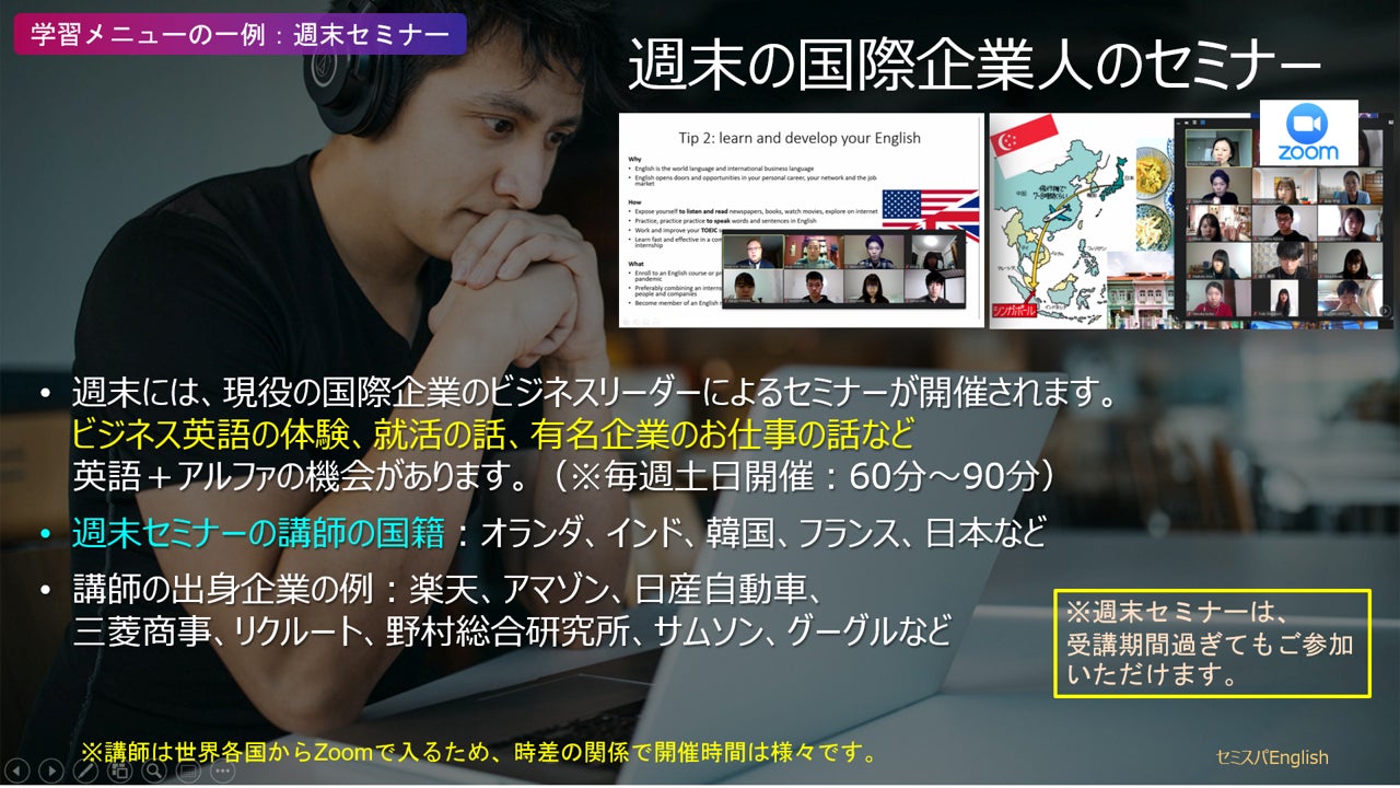 週末にはGAFAや日本の国際企業の現役リーダーが世界各地から登場してZoomセミナーを行い、受講生は家に居ながら国際舞台での英語力・ビジネス英語体験や異文化にも触れられます。