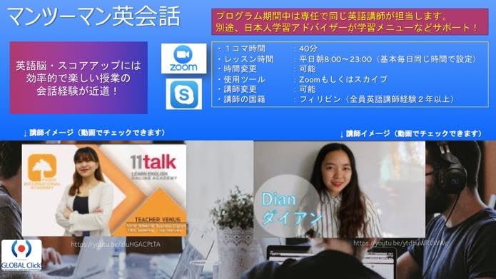 1.1,000円:英会話体験レッスン1回(オンライン・40分)一度オンラインで英会話の体験をしてみたいという方、ぜひお試しください。Zoomで平日10:00~23:00の間で行っております。