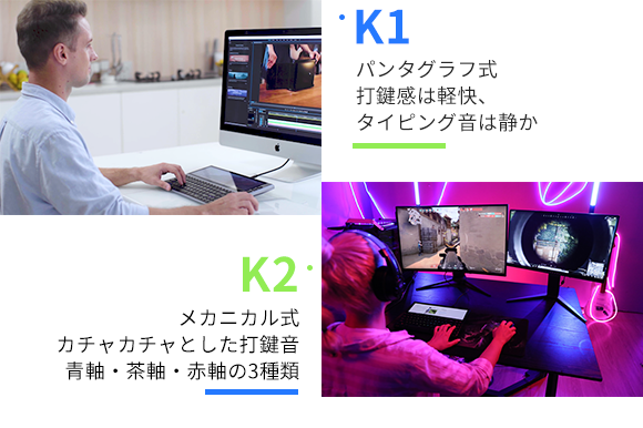 パンタグラフ式K1とメカニカル式K2の2種類をご用意。どちらもRGBバックライトが備わります。K2は青軸・茶軸・赤軸の3種類から選べ、静音性を求める方にも打鍵感を求める方にもご満足いただけます。