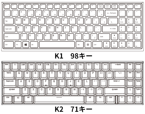 A:日本語配列のキーボードはありません。K1もK2共に英語配列です。