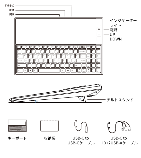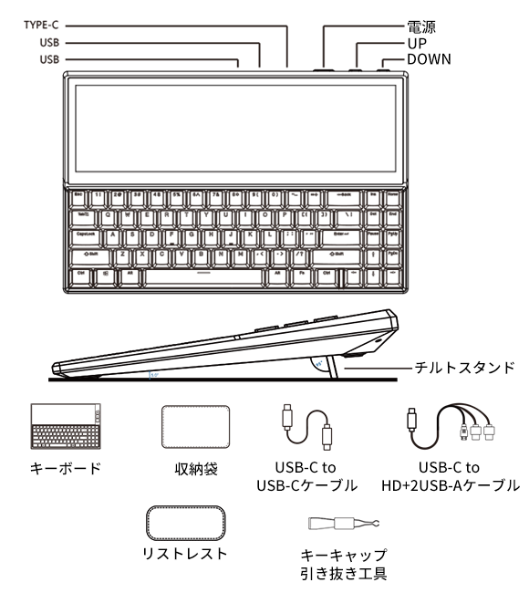 HDMIと2つのUSB-A搭載デバイスは、USB-C to HDMI+USB-Aケーブル×2でキーボードと接続できます。
