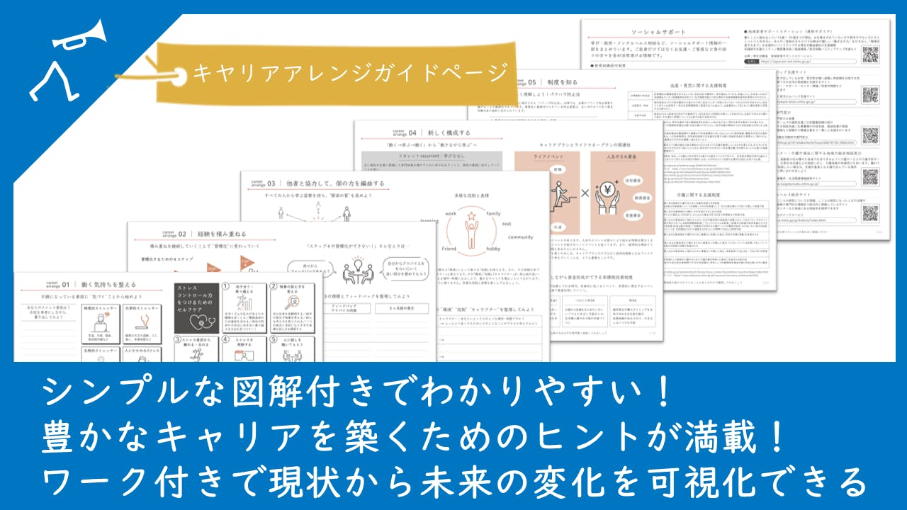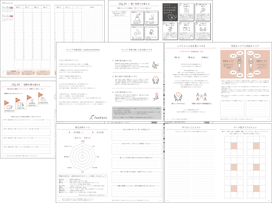 手帳巻末には、よくある仕事の悩みを図解で解説したキャリアアレンジガイド付録付き!付録とは思えないほど必要なキャリア情報のまとめページやワークも満載!