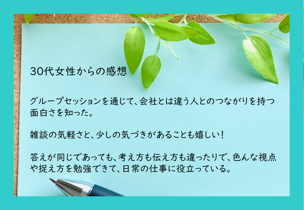 グループ対話を通じて、気持ちを共有し、多角な視点や考えに気づくことができます。グループセッションには、「オンライン振り返り会」と「キャリアレッスン」の2つのメニューがあります。