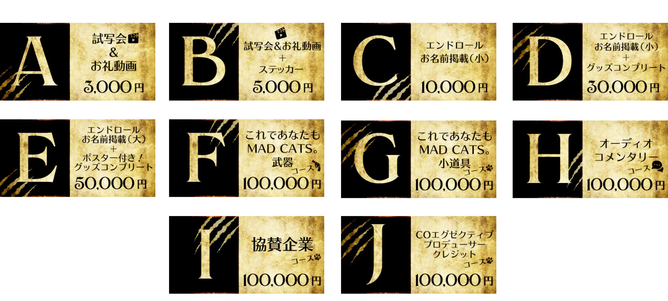 映画「MAD CATS」を愛したくなるような、様々なリターンを用意しています。