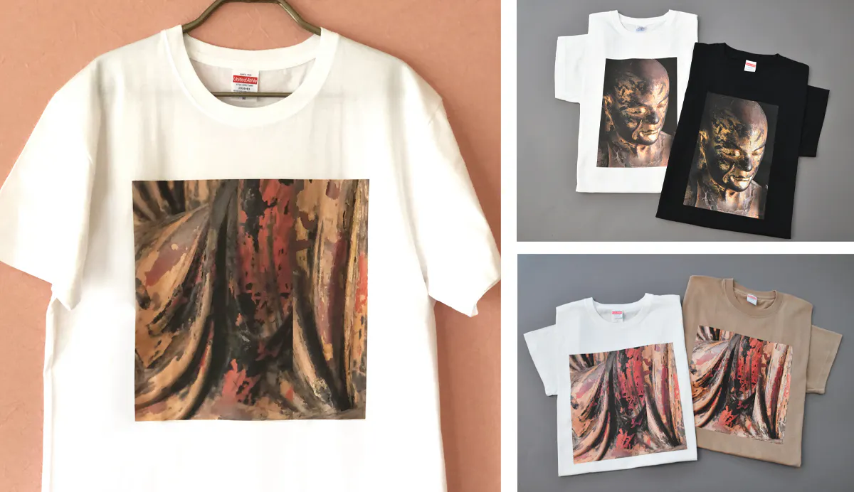 羅漢様のお顔と表層を配置したTシャツをそれぞれ二色で作りました。