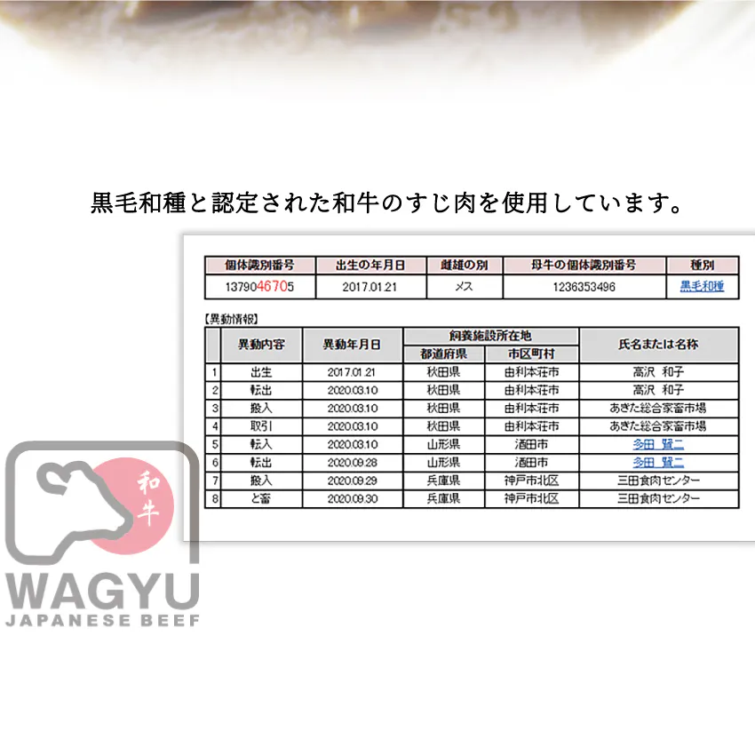・黒毛和牛すじ肉をたっぷり100g入れた大盛りの230g入り(証明書掲載)
