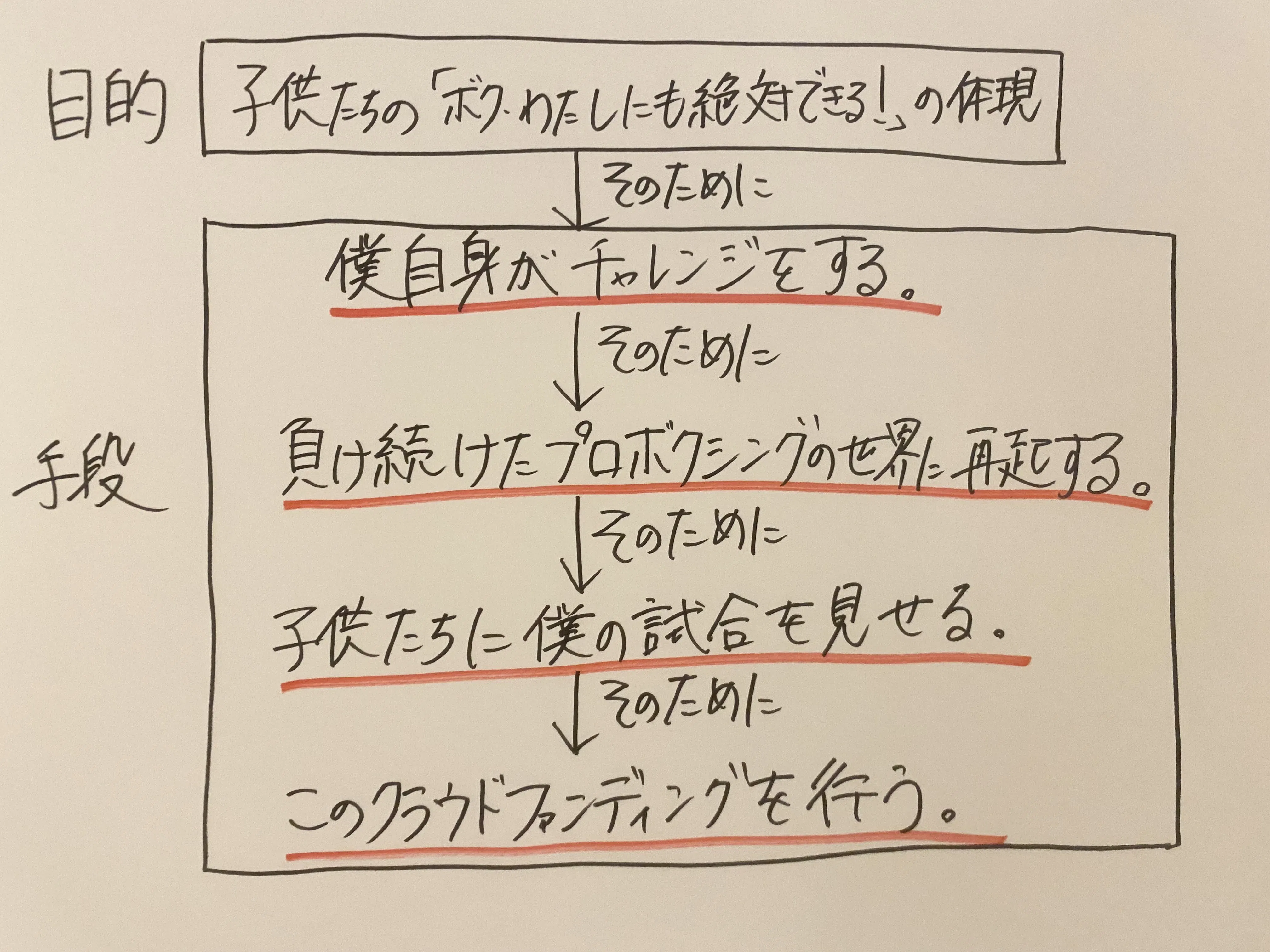 僕の小さな力と、皆さんの大きな力を合わせ、このプロジェクトによって、たくさんの子供たちに勇気を与える試合を僕にさせてください。