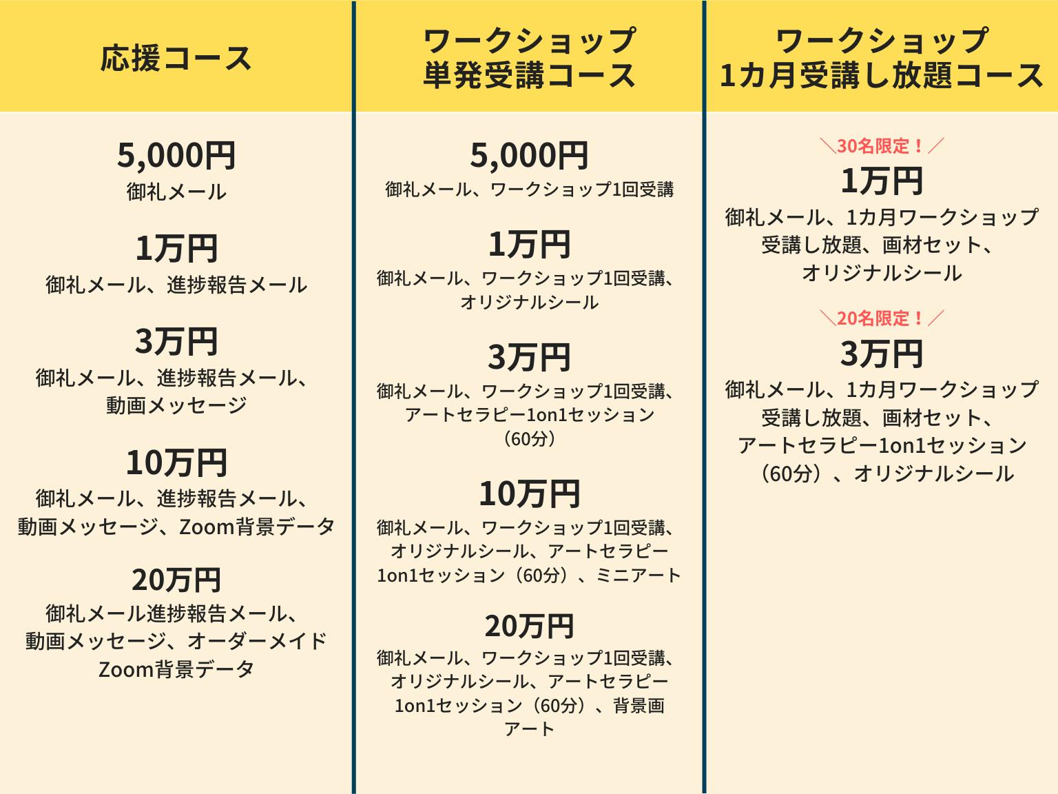 シンプルにご支援を頂く「応援コース」の他、12月のサービスローンチ後実際のワークショップを1回選んで受講できる「ワークショップ単発受講コース」、月40講座の中から1カ月間好きなだけ受講できる「ワークショップ1カ月受講し放題コース」があります。