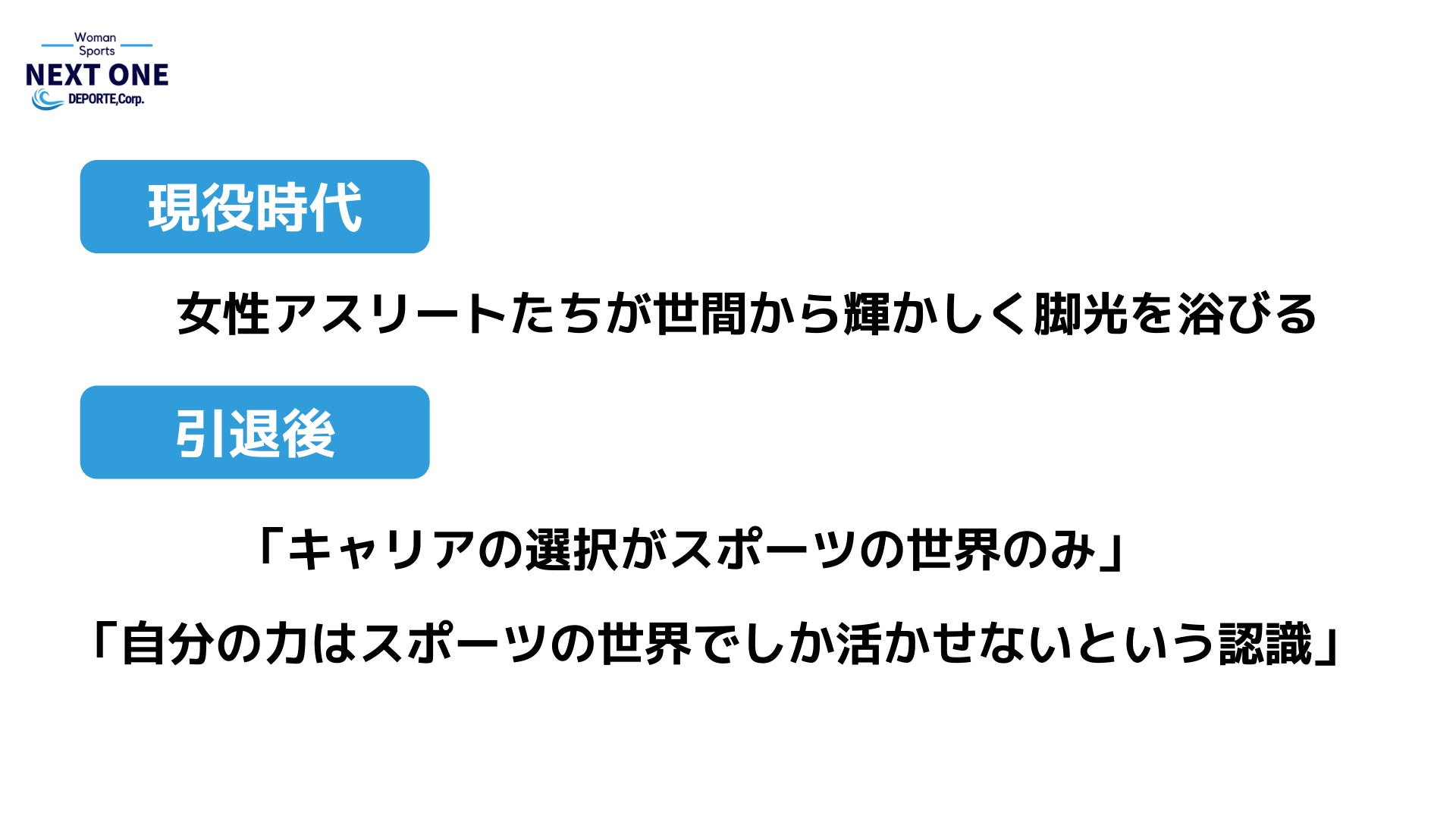 女性アスリートからキャリアの在り方を変えていき、いずれ日本の女性キャリア全体までもさらに良くしていくことが、このNEXT ONEなら実現できるのではないかと考えております。