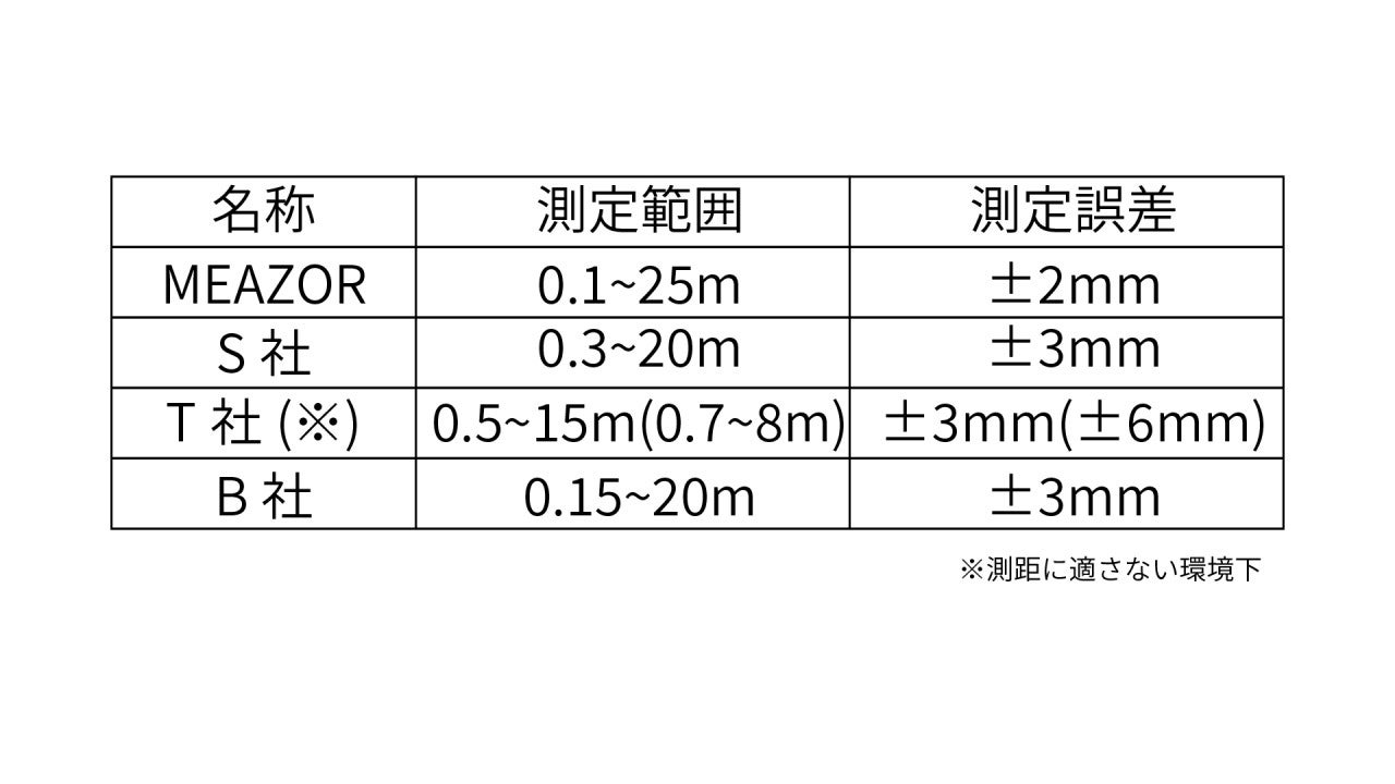 実際に他社製レーザーメジャーと比較しても、MEAZORの測定誤差は+0.35mmと、非常に高い精度を持っていることが分かりました。