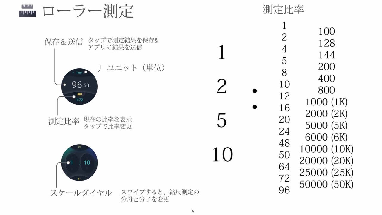 A. スケール倍率調節機能で、図面の縮尺等に応じてスケールを合わせる事で実際のサイズに準じた計測が出来ます。 現在サポートされている比率は次のとおりです。 1)1:1から1:50000までの50のスケールダウン比率(縮尺) 2)1:1から1:10までの4つのスケールアップ比率 (倍尺) 今後、さらに多くの比率が導入される予定です。