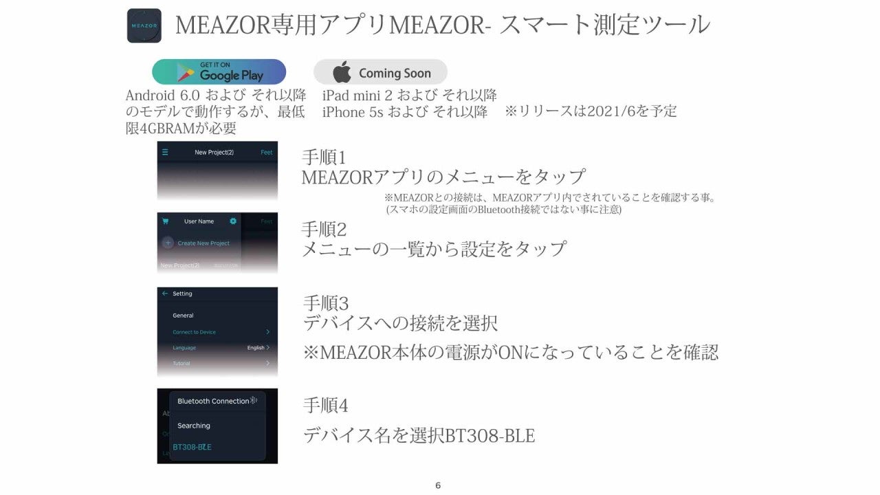 A. MEAZOR APPAndroidはAndroid6.0以降で動作し、少なくとも4GBのRAMが必要です。