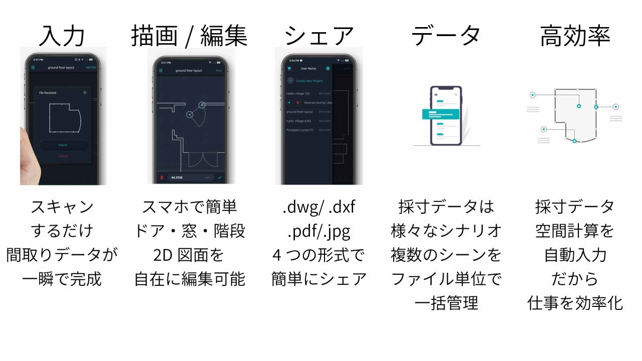 直感的で使いやすいアプリは、スマホから簡単に測定データを入出力可能です。 アプリでは、壁・ドア・窓・階段などがボタン1つで作れ、それをなぞるだけで2D図面に反映します。 また、線も円弧、線、曲線など複数のパターンをボタン1つで描く事が可能です。 アプリで作製した2D製図と測定データは、さまざまな形式で出力することが出来ます。