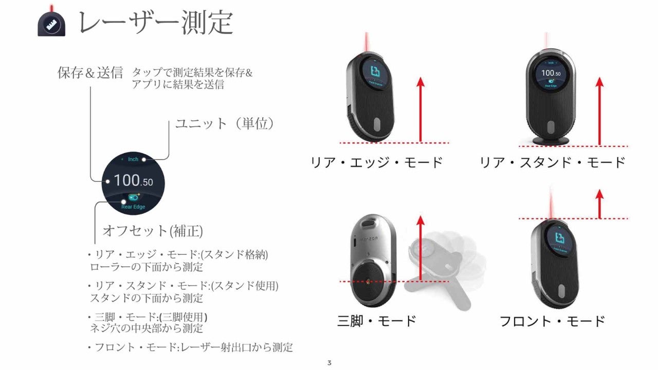 MEAZORは、スマホアプリと連携する事で、距離を測定するだけではない革新的なデジタルメジャーへと進化しました。 前モデル「ROLLOVA」の機能に、超進化した3WAYの測定方式で、採寸作業を驚くほどの短時間で効率的に行う事が出来ます。