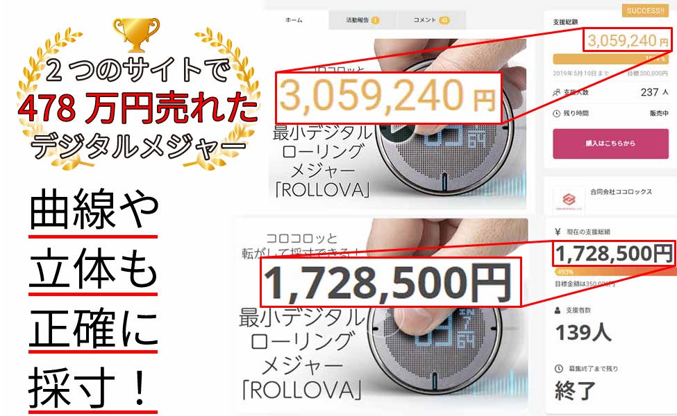ROLLOVA(ロールオーバ)は直線だけでなく3D的な曲線や立体も正確に計測できるデジタル・ローリングメジャーです。 各社クラウドファンディングサイトで478万円の支援金額を集めた商品です。