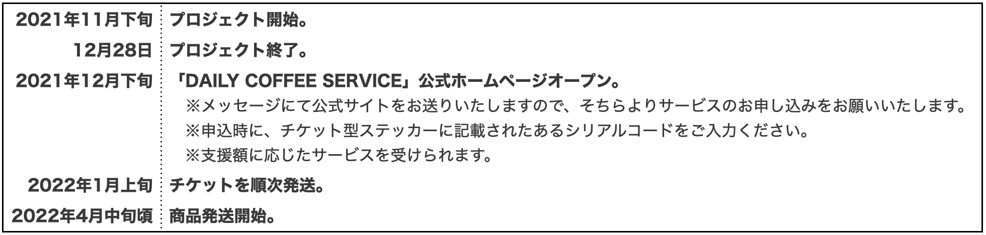 2022/04/06 19:52日頃よりDAILYCOFFEESERVICEをご愛顧いただきまして、誠にありがとうございます。ウクライナでの戦争や、コロナ禍の影響により、生産に必要な部材の納品が大幅に遅れております。そのため予定しておりました、4月発送から、【6月上旬】に変更せざるを得ない状況でございます。 楽しみにお待ちいただいたお客さまには、大変心苦しいですが、ご理解いただけると幸いです。発送時期につきましては、改めてご連絡させていただきたいと存じます。また商品発送をスムーズに進めさせて頂くため、公式HPにて、サービスの本登録をお願い致します。下記案内に従い、サービス登録をお願い致します。「CAMPFIRE」のご支援特典として、いち早く商品のお届けをお約束しておりますが、サービス登録のタイミングによっては、いち早くお届けできない場合もございます。------------------------------------------------------【リターン】1,000円OFFクーポン×3枚or6枚(ご支援額に応じる)【クーポンコード】ご登録のメールアドレスに配信しております※初回から規定回数の発送まで、 毎月1,000円を商品代金よりお値引いたします。※発送しております“フライングゲットチケット”の シリアル番号ではございません。【クーポン対象商品】PLAN-A:「専用デバイス&マグ」「専用ブレンド豆」PLAN-B:「専用デバイス&マグ」「ドリップコーヒー」※ CAMPFIREに掲載しておりましたプランから、内容を変更させていただいております。------------------------------------------------------公式HP:https://dailycoffeeservice.com/------------------------------------------------------【サービス本登録方法】◆アカウント登録1、公式HP内の “アカウント”をクリック。2、“アカウントを作成する”より新規登録ください。※ご登録のメールアドレスは、必ず“ CAMPFIRE”と同一のメールアドレスにてご登録ください。◆クーポンご利用方法1、“SUBSCRIPTION”の中から、“PLAN-A“”PALN-B”のうち、お好きなサービスをカートに入れ、“ご購入手続きへ”にお進みください。2、決済画面に、”クーポンコード”の入力箇所に該当のコードを入力ください。3、クーポンの適用後、そのまま決済を完了ください。------------------------------------------------------サービスへのご質問は、公式HP内にFAQをご用意しておりますので、併せてご確認をお願い致します。 もっと見る