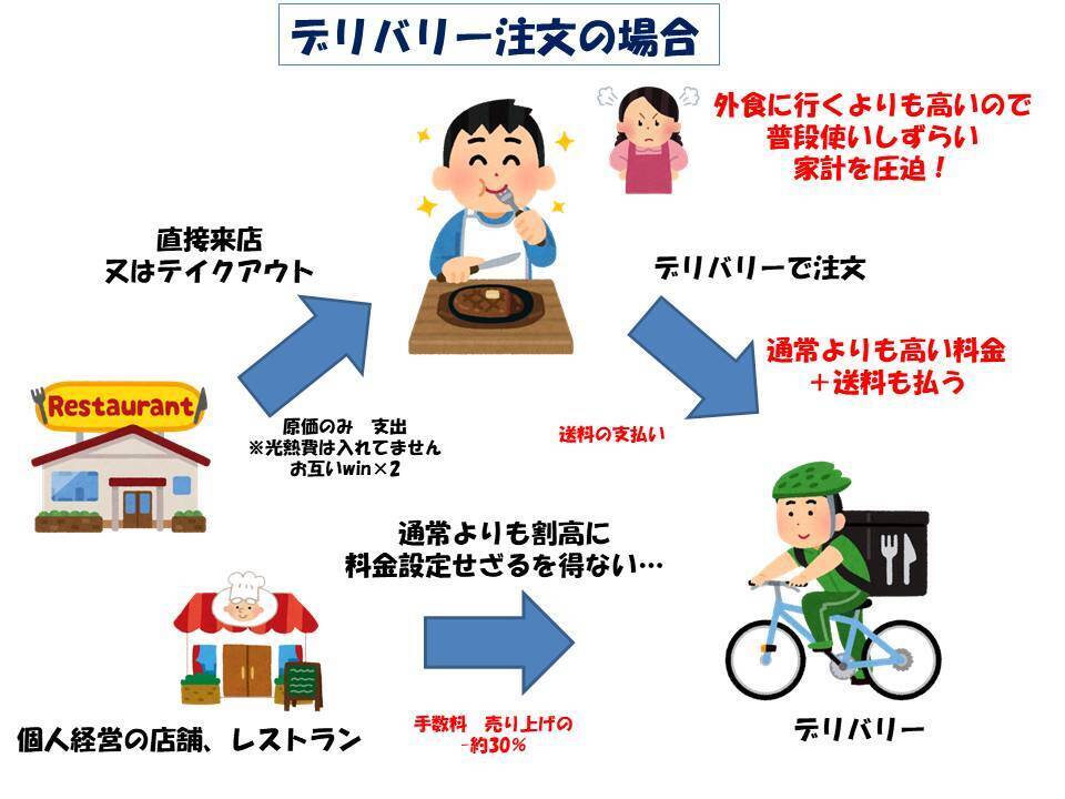 最近ではよくデリバリーのバイクや自転車を見かけます!皆さんは簡単にデリバリー契約すれば?加工食品作ればとレストラン側に思うかもしれませんが、費用は莫大です…!デリバリーですと売上の約30パーセントを手数料として引かれてしまうことも...。そのため、通常価格よりも高く設定されている事も少なくはありません。個人経営のレストランや消費者のお財布にはあまり優しくはないのが現状です。