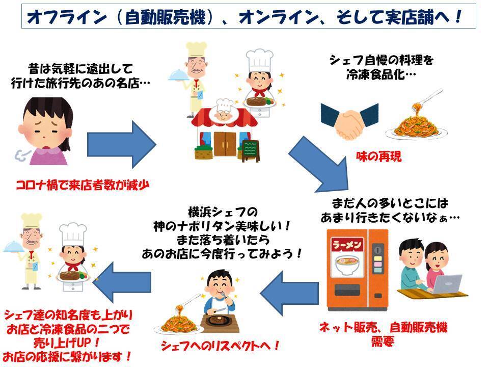 店舗が販売した冷凍食品が美味しければ、実店舗に行きたい、実店舗の常連様ですとあのお店の冷凍食品を頼んでみようかなとも思います!本当のシェフの味や、コース料理も食べてみたいとなります。シェフ達のブランディングにも繋がります!