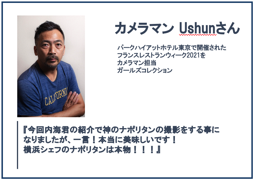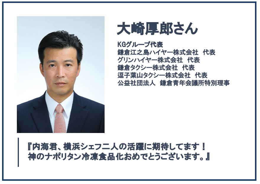 由比っとで提供されていた『 神のナポリタン 』は、発起人の内海はもちろん、多くのファンをも虜にしてきました。「もうあの味を食べることはできないのか...」誰もが諦めていたそんな時、『神のナポリタン』冷凍食品化の話が持ち上がりました。私、内海が住んでいたフランスでは、料理人はアーティストとして扱われますが、料理人達から『神だね!』と言われた逸品をつくりあげた横浜シェフは、まさに「アーティスト」と呼ぶにふさわしい方です。
