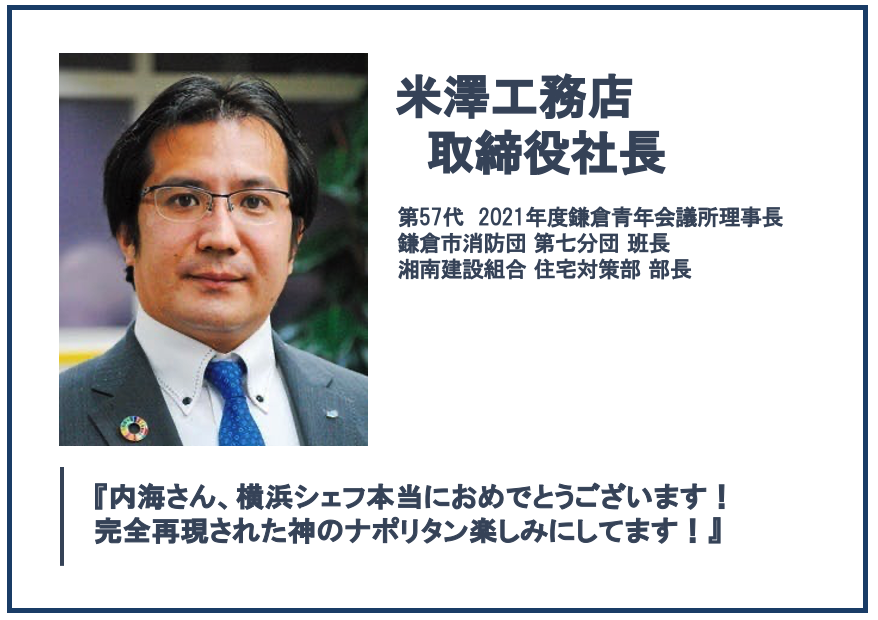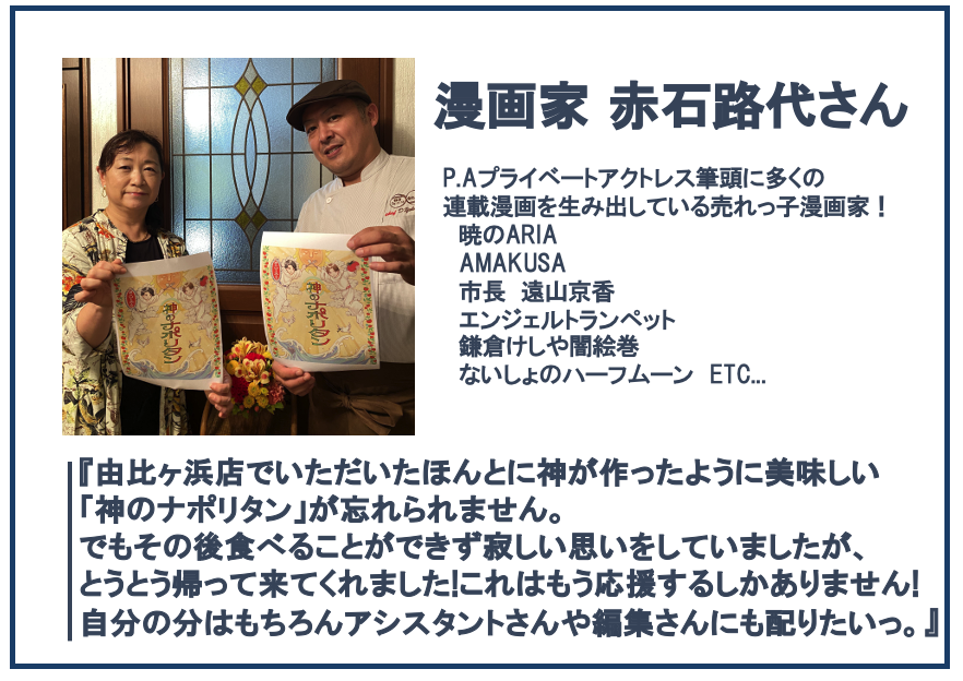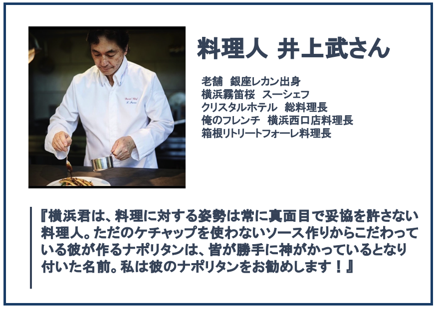 多くのTV番組やメディアに取り上げられ、有名人のファンも多い料理人横浜シェフ。TV番組で某人気デュオアイドルに、『今まで食べたナポリタンで一番美味い!』と唸らせたほどの腕の持ち主です。残念ながら2019年に鎌倉由比ヶ浜通りの店舗は閉店しましたが、シェフの魂「神のナポリタン」を復活させて欲しいと言うお声を沢山いただきました…現在は『神のナポリタン』を冷凍食品で復活させるべく、獅子奮迅の勢いでキッチンカーにて出張シェフ中。