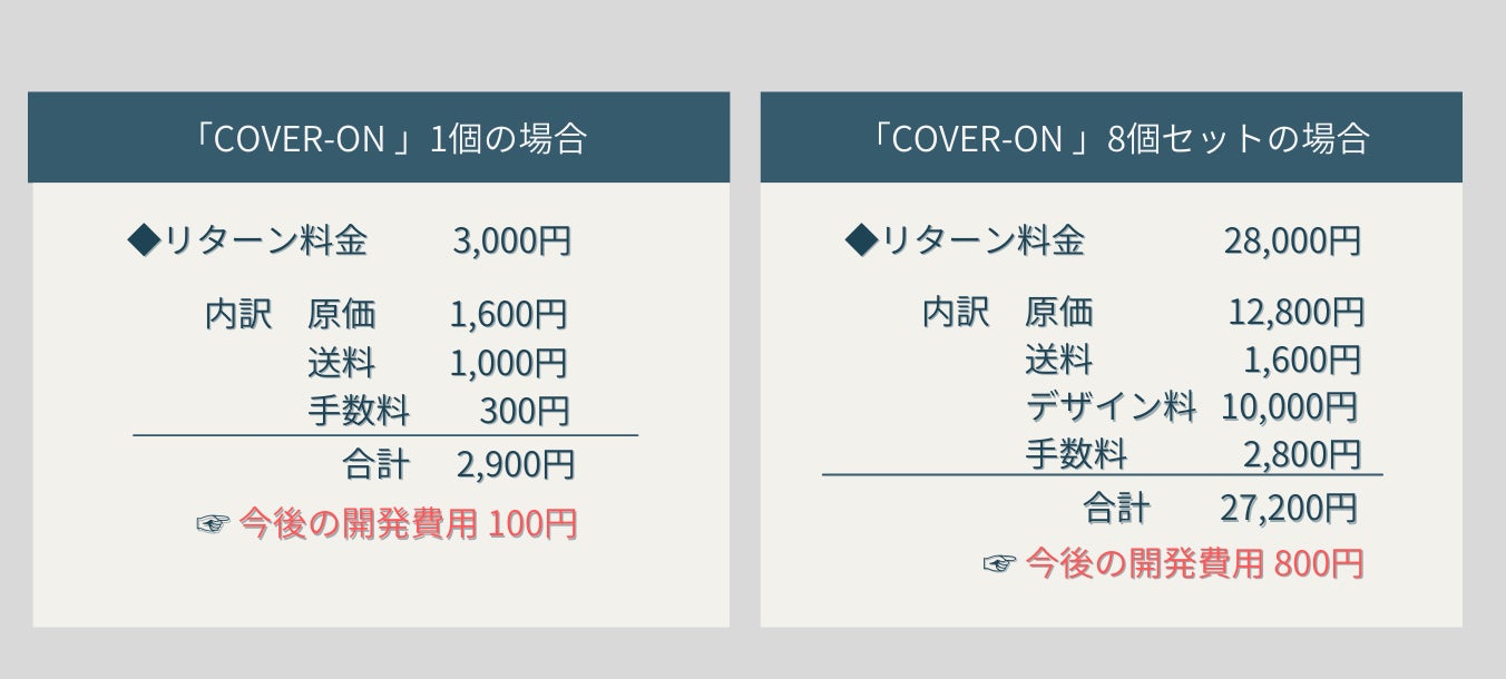 ※今回のクラウドファンディングは、認知度拡大のために行っています。参考までに、「COVER-ON」1個と、8個セットのリターンの内訳を記載します。