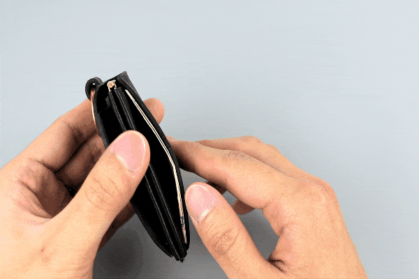 「ワンマイルウォレット」は会計時の効率を考え、ホックを開けることなく、お札を取り出すことができるギミックを搭載しました。