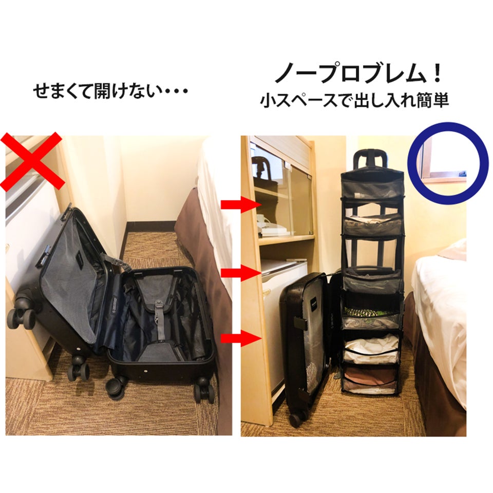 ホテルに着いてガラッとスーツケースを広げたら、中からスルスルっとシェルフが登場。そこはもうクローゼット。