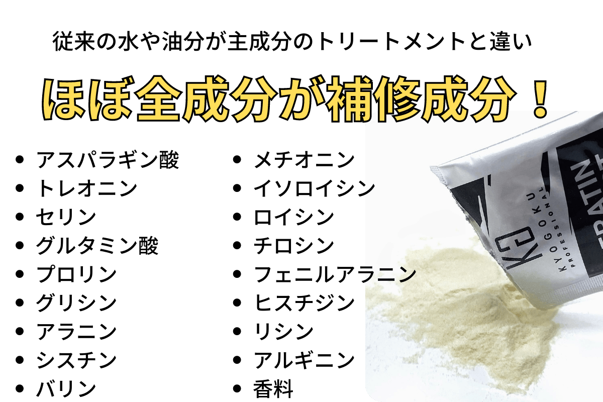 一般的に使用されているケラチンは、羊毛が原料となっているケラチンが多い中、「KYOGOKUケラチンブースト+」は人毛由来のケラチンを配合しています。