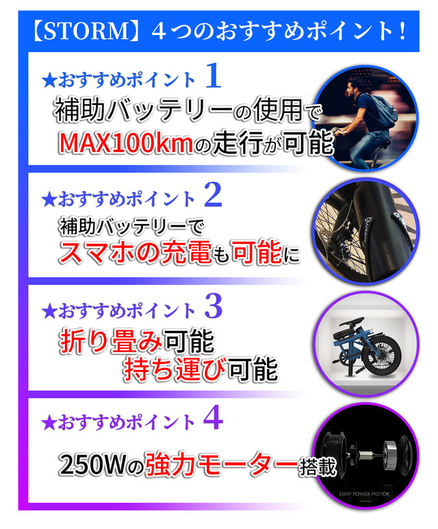 弊社の販売する電動アシスト自転車【STORM】は、補助バッテリー(別売り)を併用すると、1度の充電で最大100kmの走行が可能!