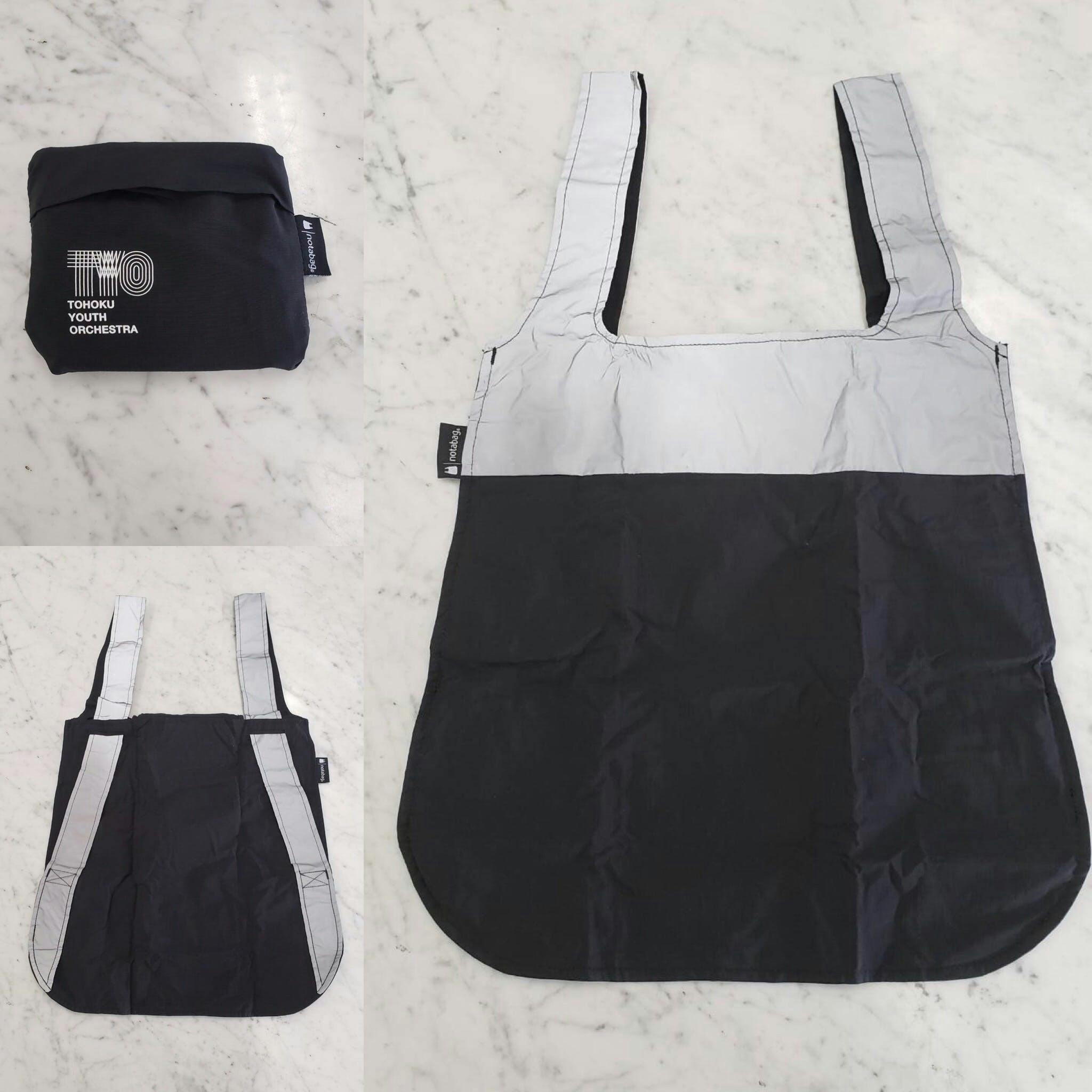 トートバックにもリュックにもなる「notabag」。小さく折り畳んで収納することができるので、行きは手ぶらで買い物に出かけ、少しの荷物ならトートバックに、荷物が多かったり重かったりする場合はリュックサックにするなど、状況に合わせた使い分けが可能。表面には反射素材を採用しているため、夜間や災害時の利用にも役立ちます。収納ケースにはTYOロゴが入っています。
