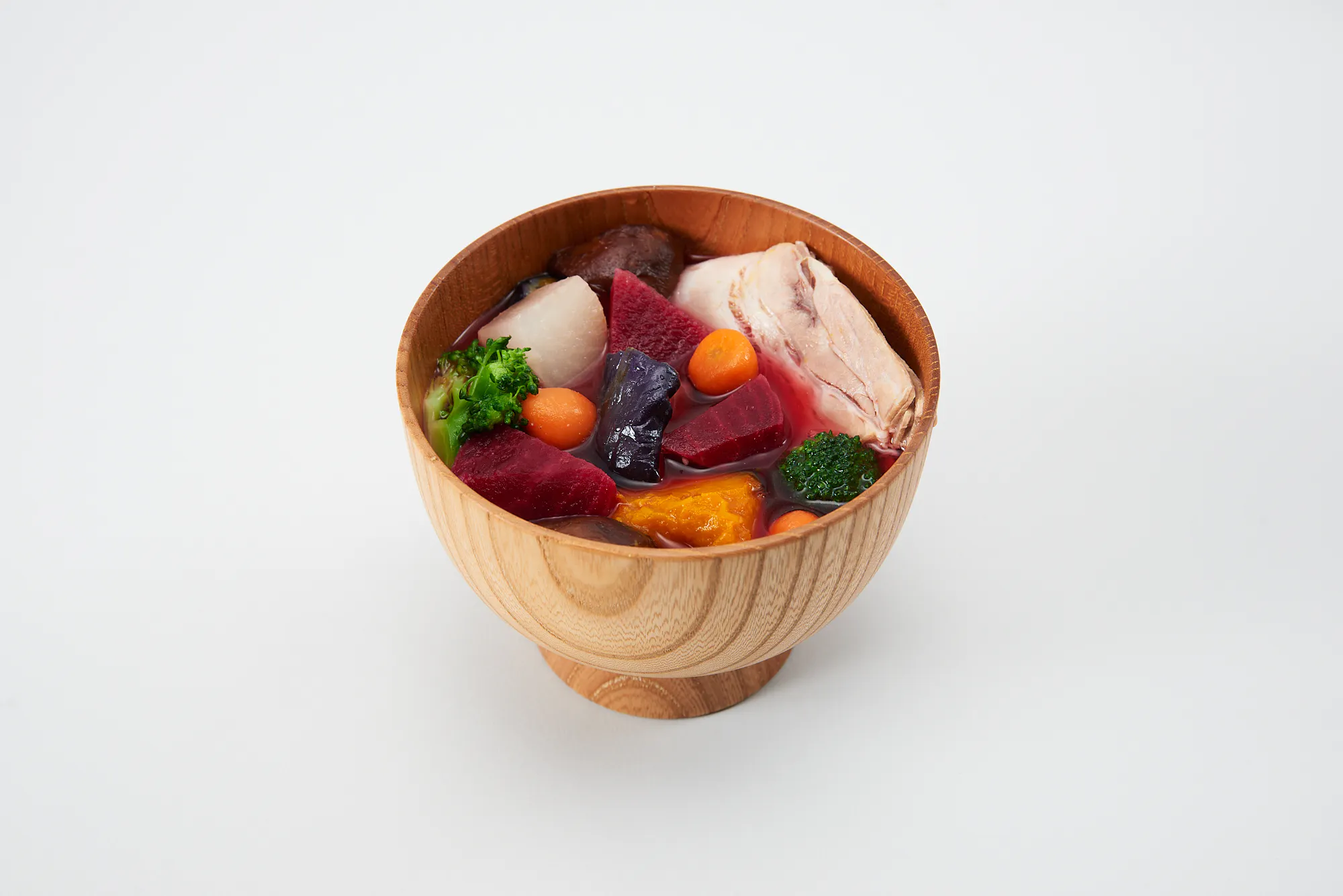 ・原材料名:ビーツ(熊本県産)、蒸し豚肉、揚げなす、かぼちゃ、こまつな、豆腐、ブロッコリー、味噌、しいたけ、だいこん、パリジャンキャロット、甘酒、大豆発酵食品、乾燥ごぼう、煮干し粉末、かつおのかれぶし、昆布粉末、酵母、椎茸粉末/加工でん粉、塩化マグネシウム(にがり)、(一部に豚肉、大豆、を含む)
