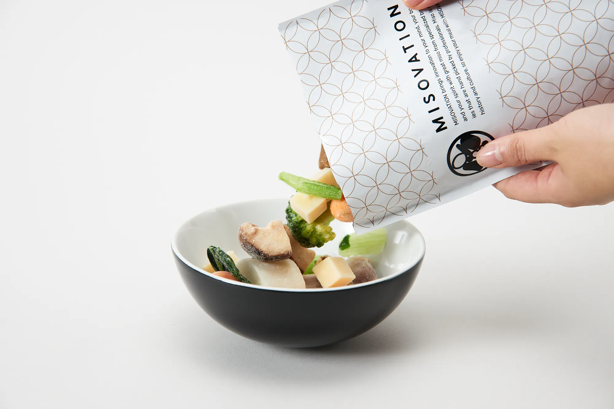 MISOVATIONでは豚肉・野菜・味噌などの食材をそのまま瞬間冷凍し、パウチに詰めています。食材のフレッシュさ・味噌の風味・加熱に弱い栄養素がしっかりと残るよう、レトルトでもフリーズドライでもなく、冷凍という規格で開発を行いました。