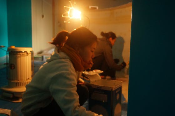コンテナショップを作った時と同様に、全国各地から集まってくれている仲間みんなで解体作業を行い、 カタチ作っています。すでに解体作業が終わって、床下の工事を行っています。材料などできる限り再利用しています。厨房機器や食器なども、仲間が使っていた大切なものを低価格で譲っていただいたり、中古品を頂いたり、できるだけお金をかけずに揃えていっているところです。